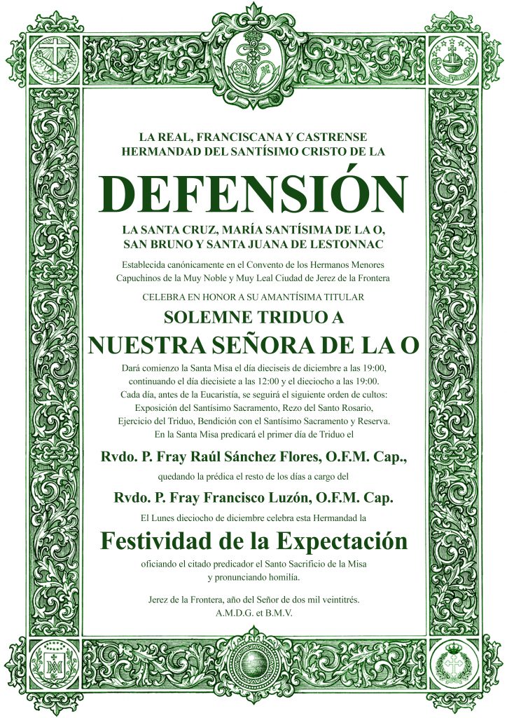 El Triduo a la Virgen de la O tendrá lugar durante los días 16, 17 y 18 de diciembre, iniciándose a las 18.35 horas con el rezo del Santo Rosario, Ejercicio del Triduo y Reserva de Su Divina Majestad. La eucaristía comenzará a las 19.00 horas, estando la predicación a cargo del sacerdote marianista y párroco de la del Pilar, D. Ignacio Sánchez Galán.