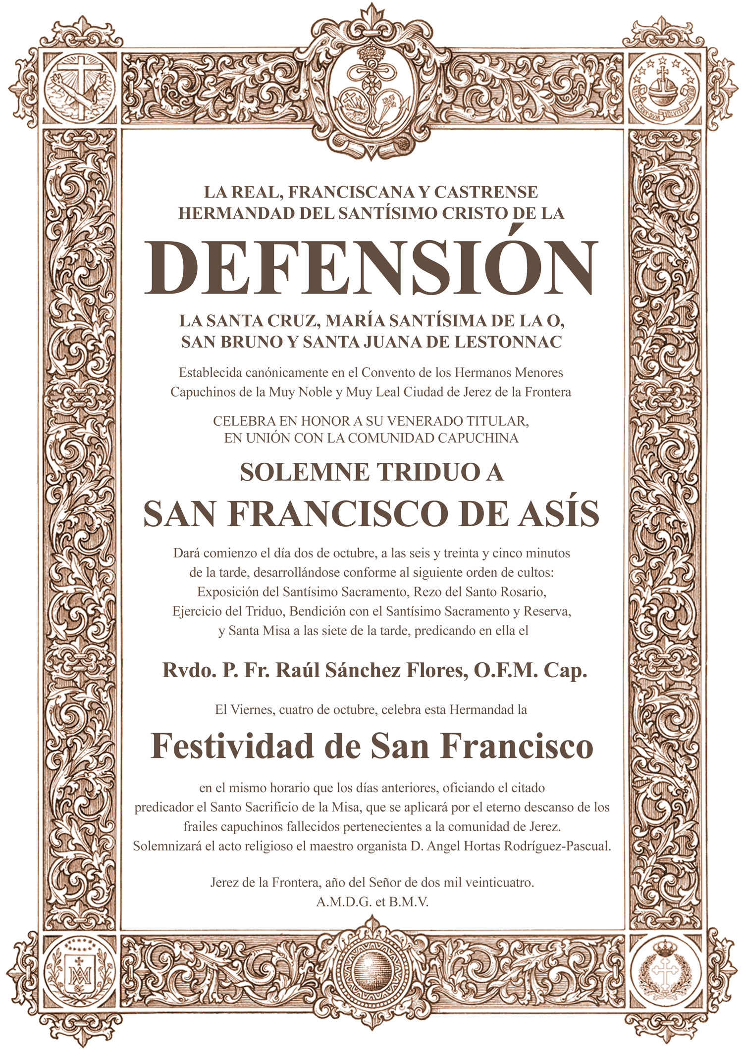 El Triduo a la Virgen de la O tendrá lugar durante los días 16, 17 y 18 de diciembre, iniciándose a las 18.35 horas con el rezo del Santo Rosario, Ejercicio del Triduo y Reserva de Su Divina Majestad. La eucaristía comenzará a las 19.00 horas, estando la predicación a cargo del sacerdote marianista y párroco de la del Pilar, D. Ignacio Sánchez Galán.